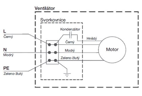 ![]() | Svorkovnice Svorkovnice je standardně umístěna na skříni ventilátoru. Připojení kabelu je možné po sejmutí víka svorkovnice ze spodní strany motorového krytu. | |