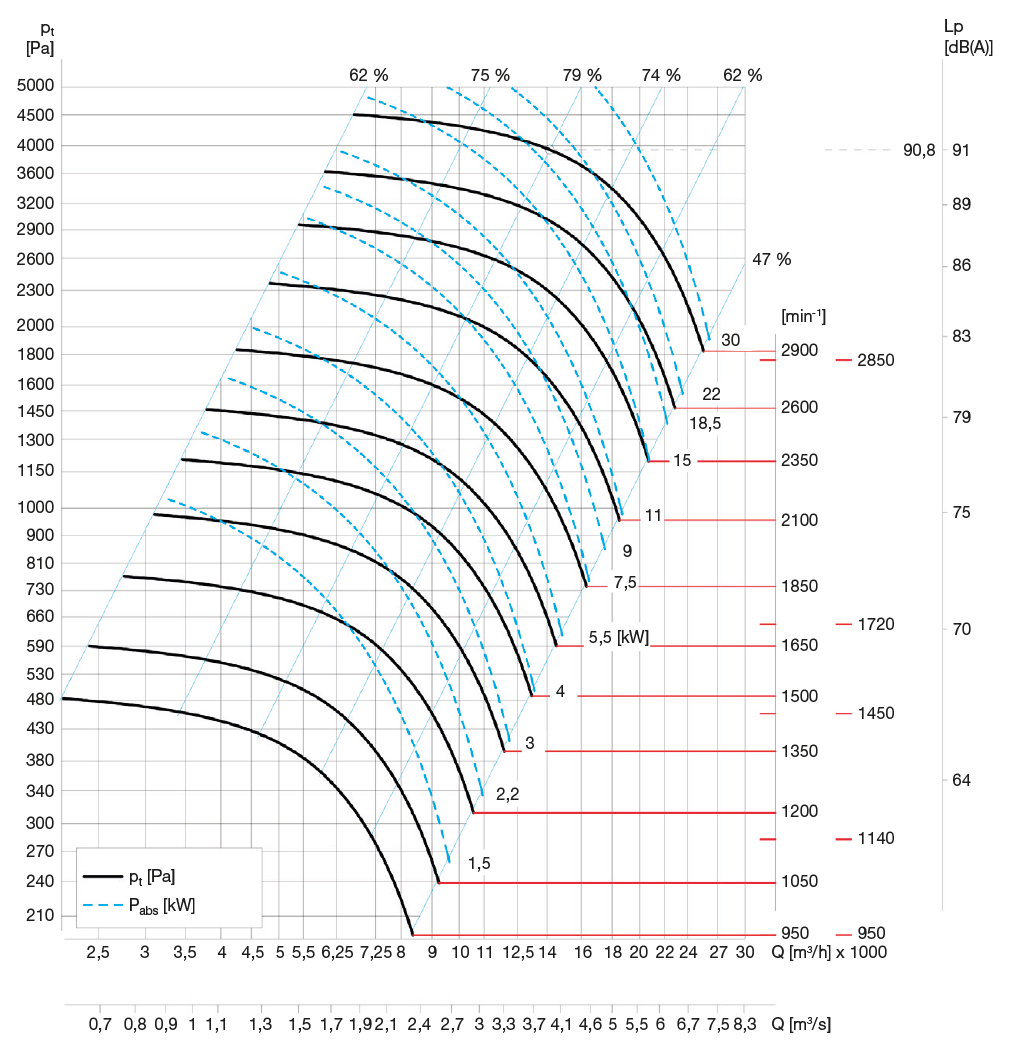 ![]() | Hluk Hladina akustického tlaku ve vzdálenosti 1,5 m ve volném akustickém poli se odečte na stupnici Lp výkonového diagramu z průsečíku křivky otáček a přímky nejvyšší účinnosti. Akustický výkon v jednotlivých oktávových pásmech pro různé hodnoty otáček je uveden v tabulce pod diagramem. Hodnoty jsou měřeny s tolerancí ±3 dB. | |