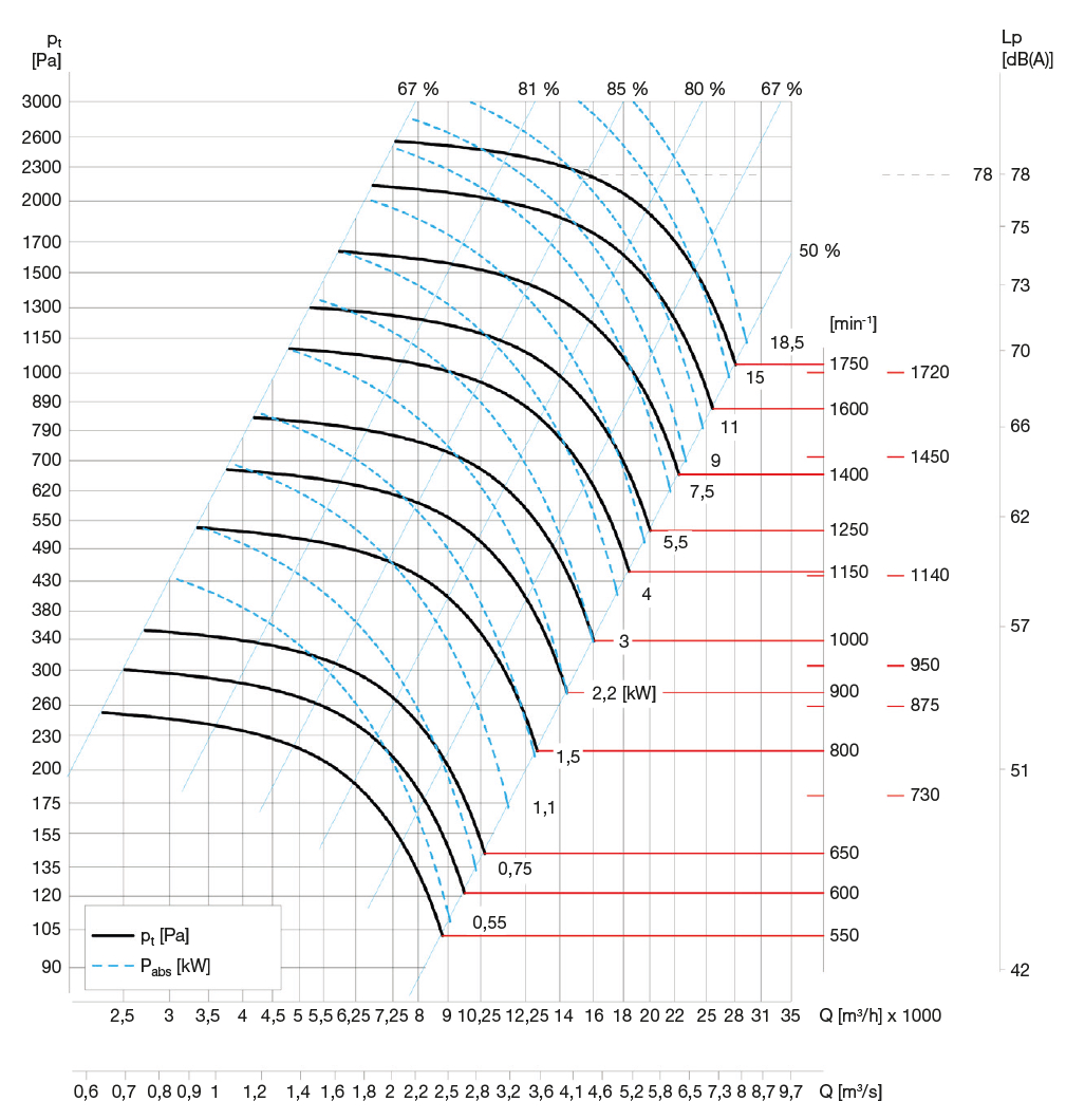 ![]() | Hluk Hladina akustického tlaku ve vzdálenosti 1,5 m ve volném akustickém poli se odečte na stupnici Lp výkonového diagramu z průsečíku křivky otáček a přímky nejvyšší účinnosti. Akustický výkon v jednotlivých oktávových pásmech pro různé hodnoty otáček je uveden v tabulce pod diagramem. Hodnoty jsou měřeny s tolerancí ±3 dB. | |