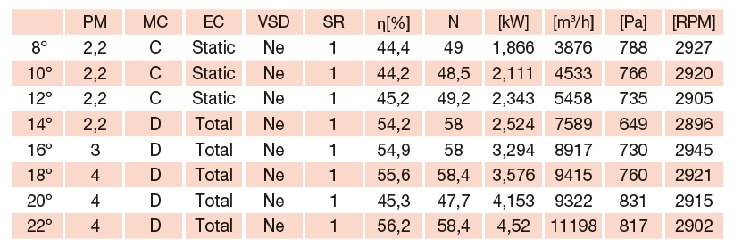 | otáčky [min-1] | počet listů | příkon [kW] | napětí [V] | proud [A] | průměr připojení [mm] | hmotnost krátká skříň [kg] | hmotnost dlouhá skříň [kg] |
