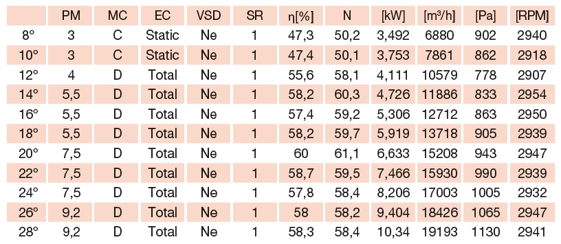 | otáčky [min-1] | počet listů | příkon [kW] | napětí [V] | proud [A] | průměr připojení [mm] | hmotnost krátká skříň [kg] | hmotnost dlouhá skříň [kg] |