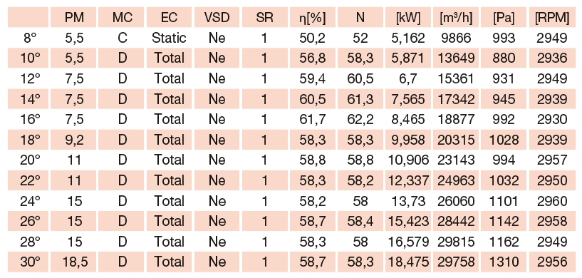 | otáčky [min-1] | počet listů | příkon [kW] | napětí [V] | proud [A] | průměr připojení [mm] | hmotnost krátká skříň [kg] | hmotnost dlouhá skříň [kg] |