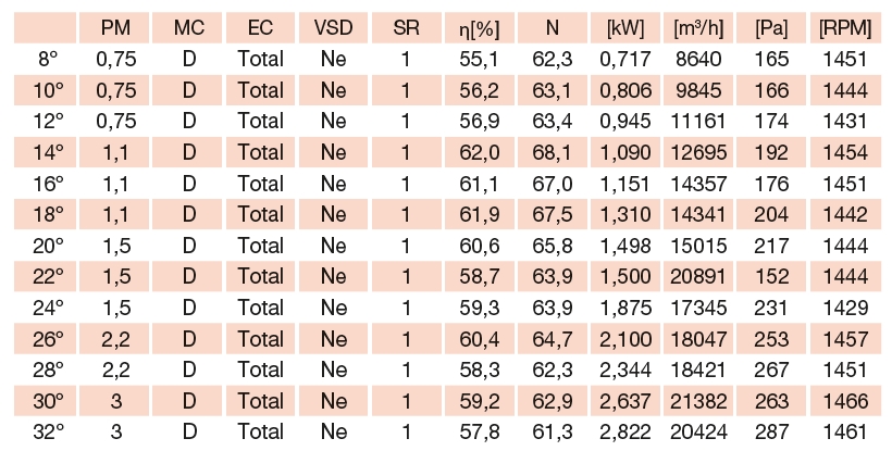 | otáčky [min-1] | počet listů | příkon [kW] | napětí [V] | proud [A] | průměr připojení [mm] | hmotnost krátká skříň [kg] | hmotnost dlouhá skříň [kg] |