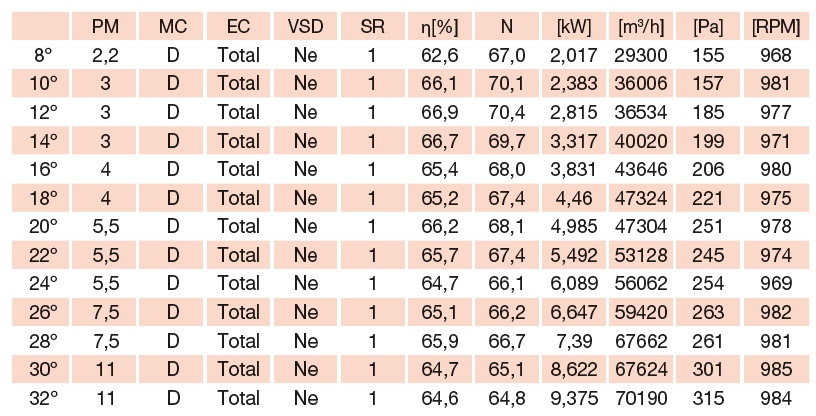 | otáčky [min-1] | počet listů | příkon [kW] | napětí [V] | proud [A] | průměr připojení [mm] | hmotnost krátká skříň [kg] | hmotnost dlouhá skříň [kg] |