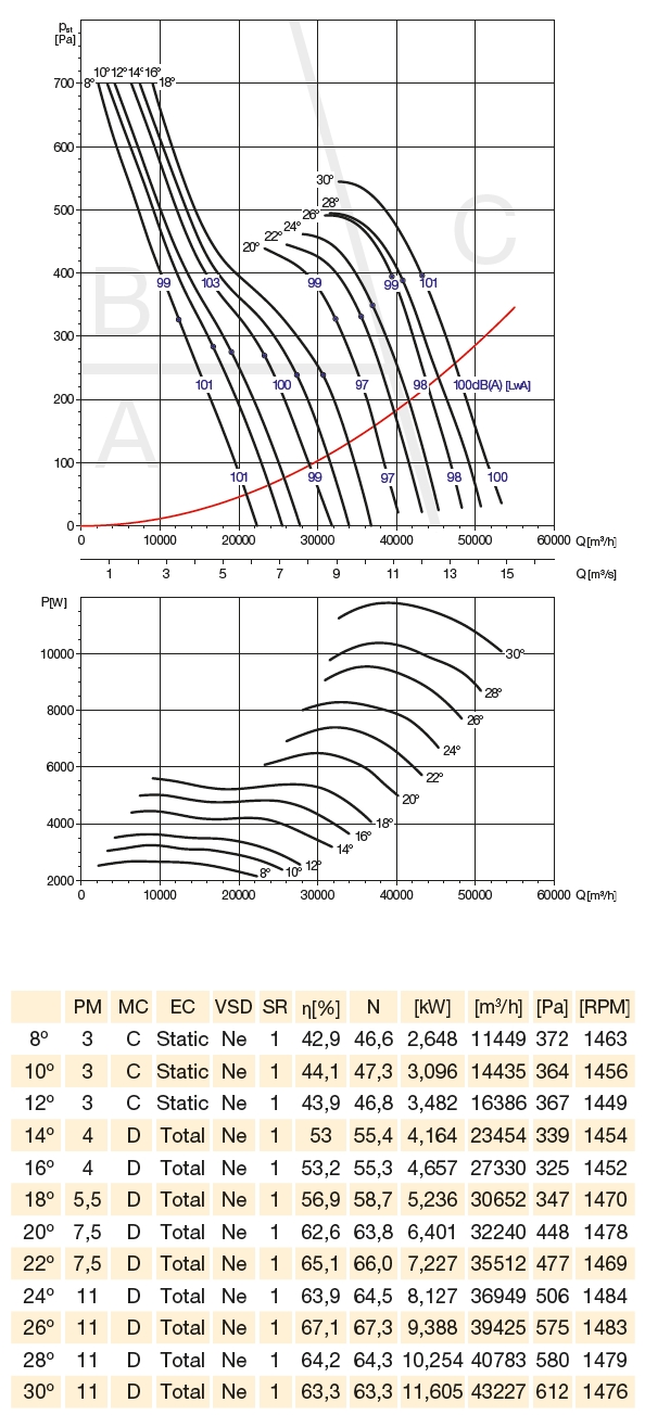 ![]() | Oběžné kolo Oběžné kolo je vyrobeno z Al slitiny a je staticky i dynamicky vyváženo. Nastavení úhlu listu oběžného kola je provedeno výrobcem, možné úhly natočení jsou uvedeny ve výkonových charakteristikách. | |