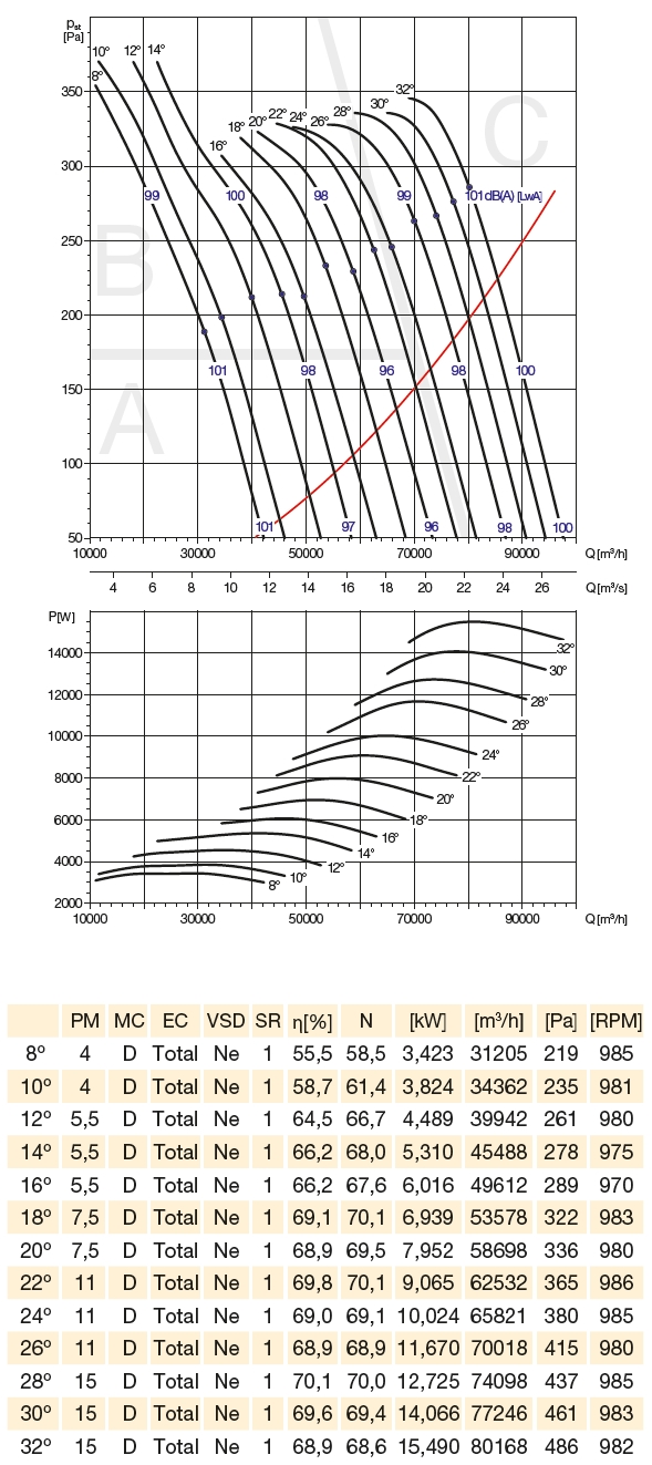 ![]() | Oběžné kolo Oběžné kolo je vyrobeno z Al slitiny a je staticky i dynamicky vyváženo. Nastavení úhlu listu oběžného kola je provedeno výrobcem, možné úhly natočení jsou uvedeny ve výkonových charakteristikách. | |