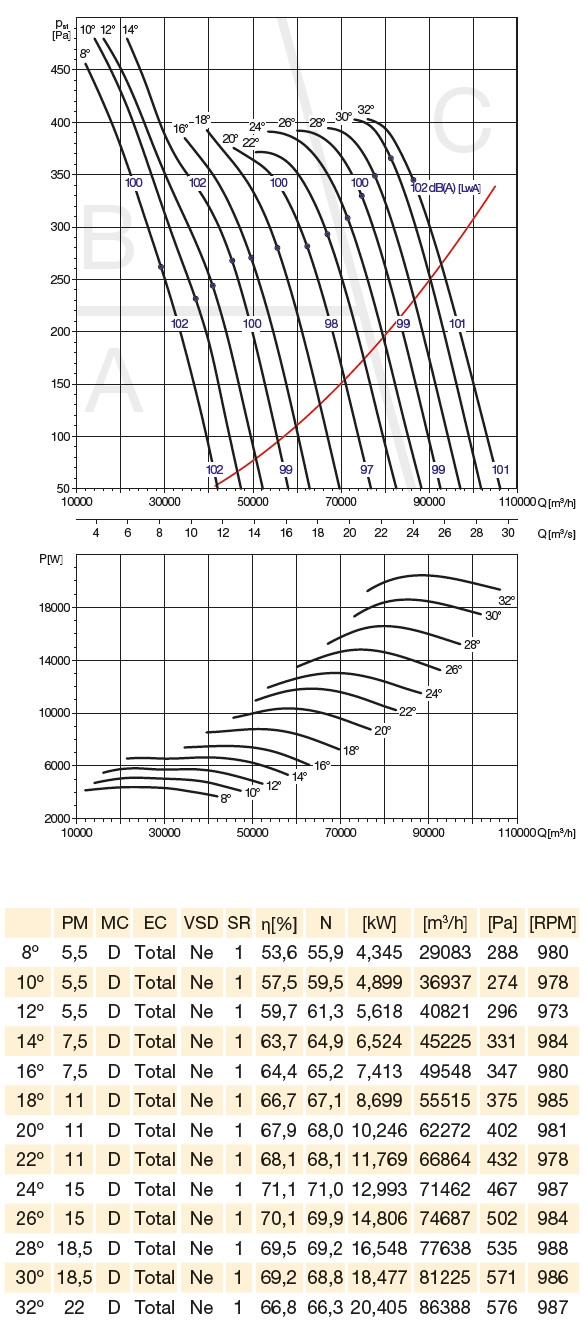 ![]() | Oběžné kolo Oběžné kolo je vyrobeno z Al slitiny a je staticky i dynamicky vyváženo. Nastavení úhlu listu oběžného kola je provedeno výrobcem, možné úhly natočení jsou uvedeny ve výkonových charakteristikách. | |