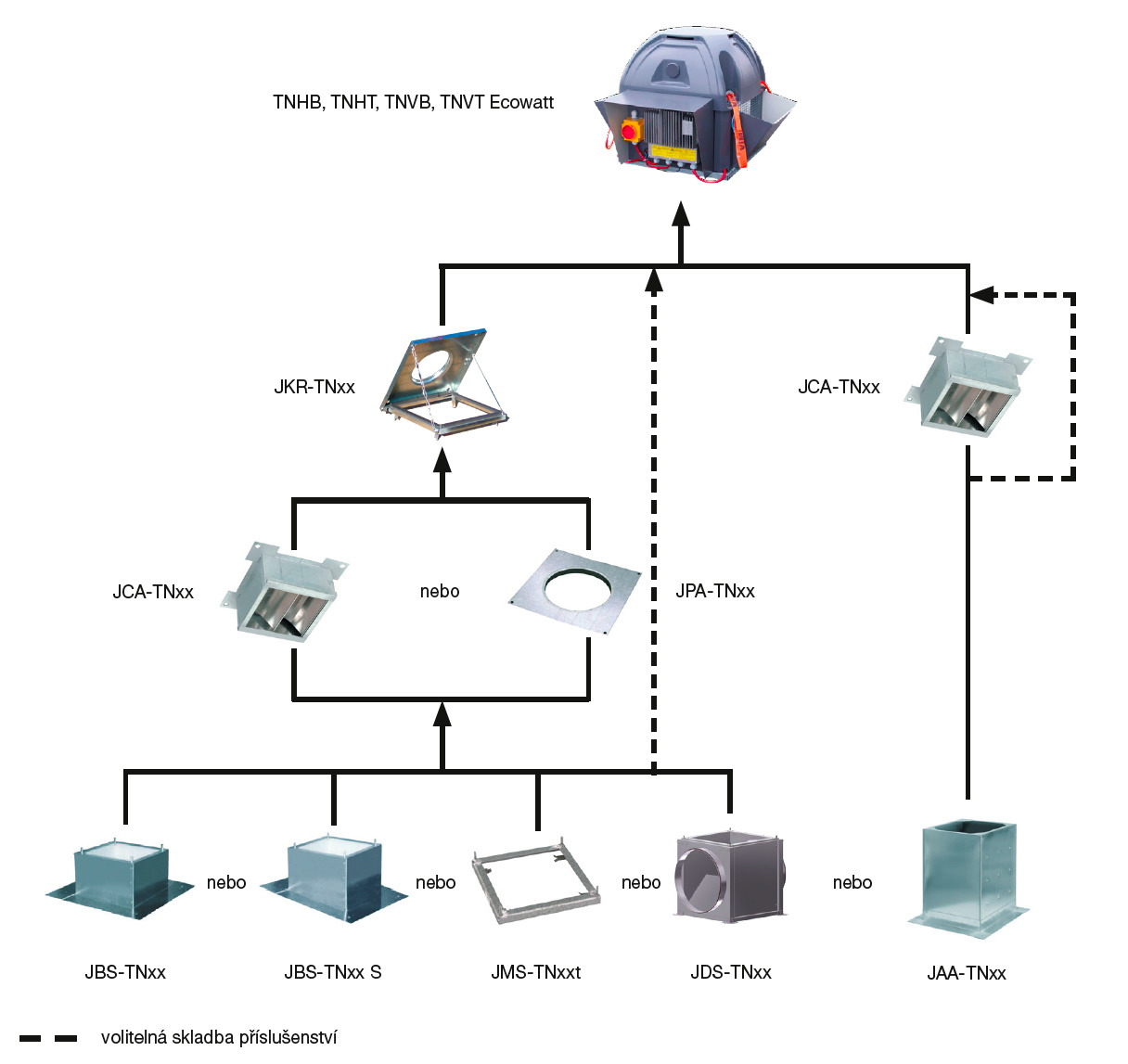 ![]() | Příslušenství • JMS-TNxx montážní rám • JBS-TNxx montážní podstavec • JKR-TNxx výklopný rám • JCA-TNxx zpětná klapka • JPA-TNxx adaptér pro připojení příruby • JAA-TNxx sokl s tlumičem • JDS-TNxx nástavec pro dvojité sání • REV regulátory otáček (K 8.1) • REB Ecowatt regulátor otáček (K 8.1) • CVF Ecowatt regulátor otáček (K 8.1) • CONTROL Ecowatt Basic regulátor otáček pro ventilátory Ecowatt (K 8.1) • AIRSENS čidla kvality vzduchu (K 8.2) • MSE, MSD motorové ochrany (K 8.2) | |