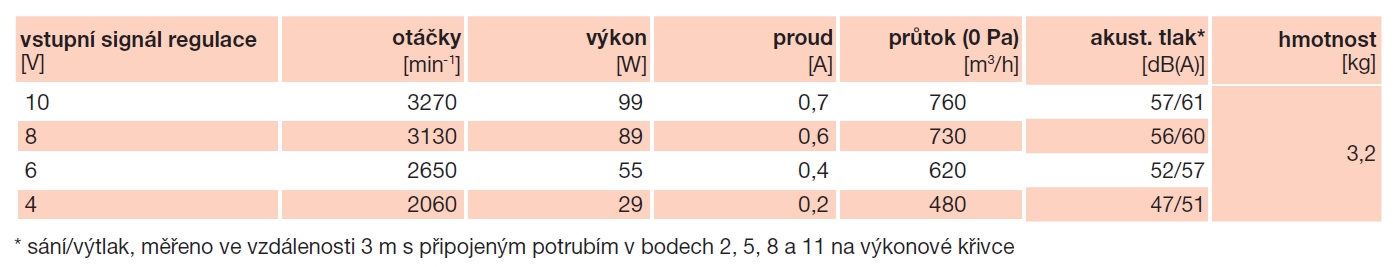 | otáčky [min-1] | výkon [W] | proud [A] | průtok (0 Pa) [m3/h] | akust. tlak* [dB(A)] | pracovní teplota [°C] | hmotnost [kg] |