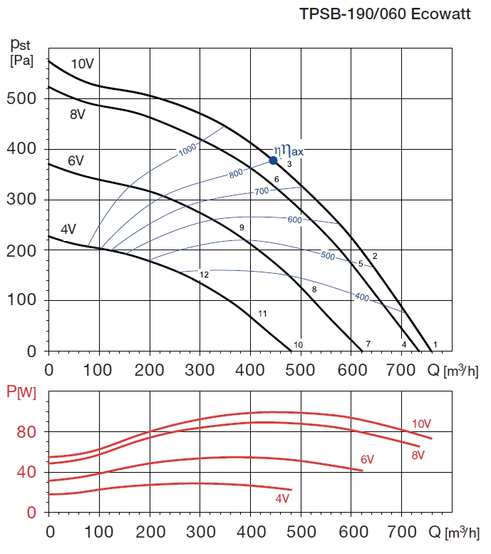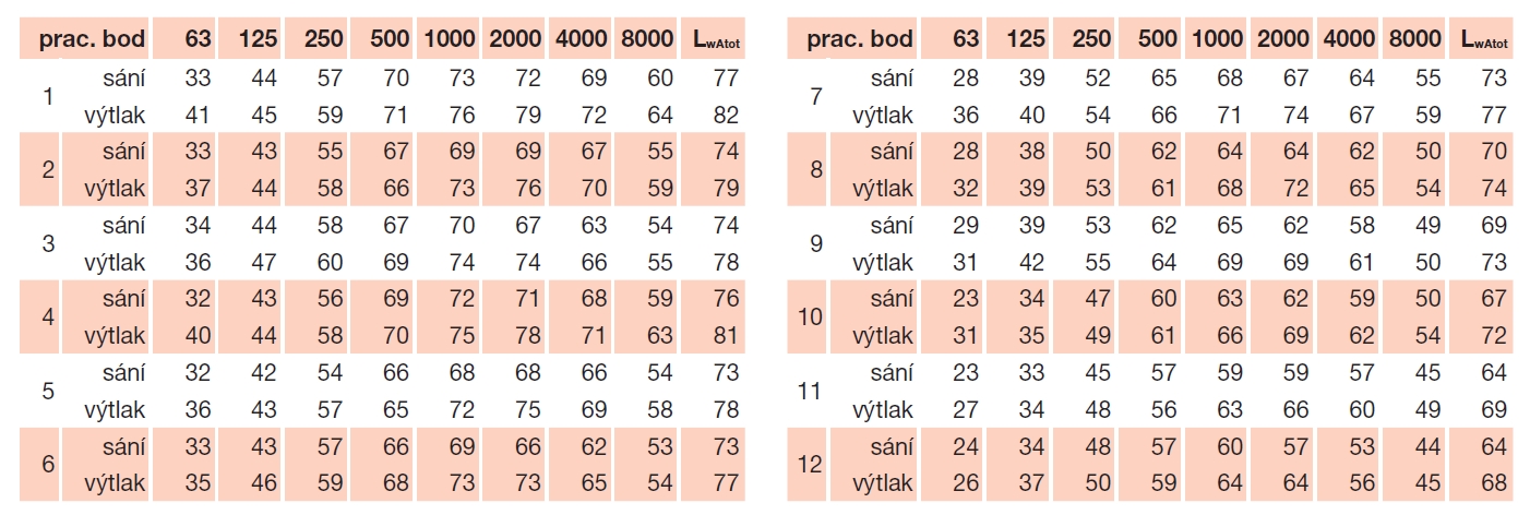 * sání/výtlak, měřeno ve vzdálenosti 3 m s připojeným potrubím v bodech 2, 5, 8 a 11 na výkonové křivce