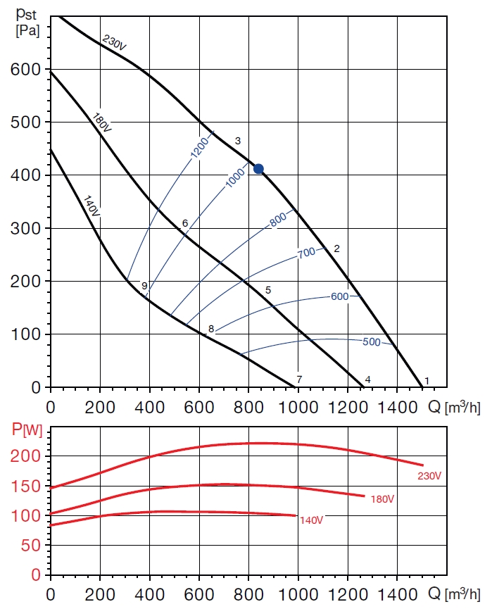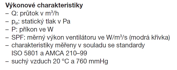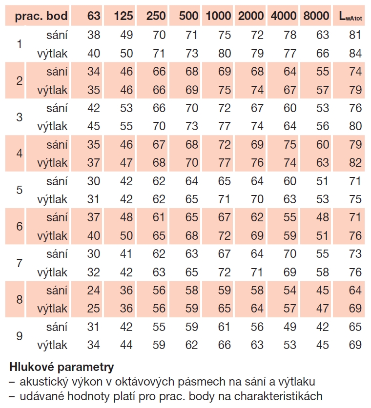 * sání/výtlak, měřeno ve vzdálenosti 3 m s ventilátrem nainstalovaným na plochém povrchu v bodě 2 výkonové křivky