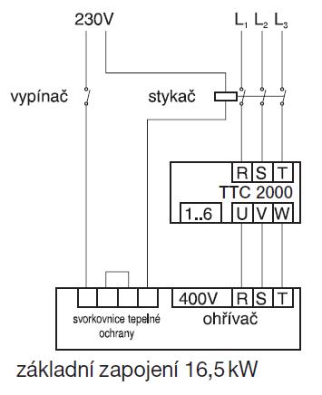Ohřívač musí mít zapojen bezpečnostní i pracovní termostat. Zátěž v jednotlivých fázích musí být rovnoměrná. |