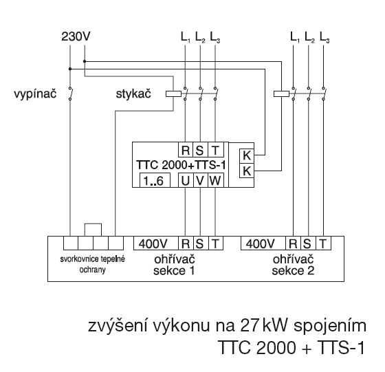 TTC 2000 nelze připojit k síti s velkým rozdílem fázových napětí. Přívodní vodiče (400 V 50 Hz) se připojují ke svorkám pro silový přívod označené RST a kabel od ohřívače na svorky UVW. Napájecí napětí k TTC 2000 je třeba vést přes stykač, který je ovládán tepelnou ochranou