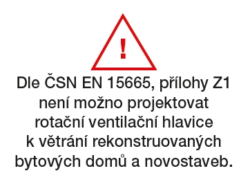 ![]() | Upozornění Ve smyslu znění ČSN EN 15665, národní přílohy Z1 s požadavky na odvětrání obytných budov není možno projektovat ani instalovat rotační ventilační hlavice do rekonstruovaných bytových domů ani do novostaveb pro zajištění větrání. Hlavice nejsou vhodné pro odvod spalin. | |