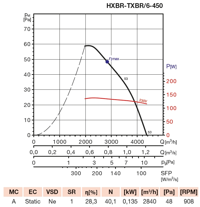 ![]() | Hluk Hluk emitovaný ventilátorem je uveden v tabulkách, měření je prováděno ve vzdálenosti rovné trojnásobku průměru oběžného kola (minimálně však 1,5 m) na straně sání. | |