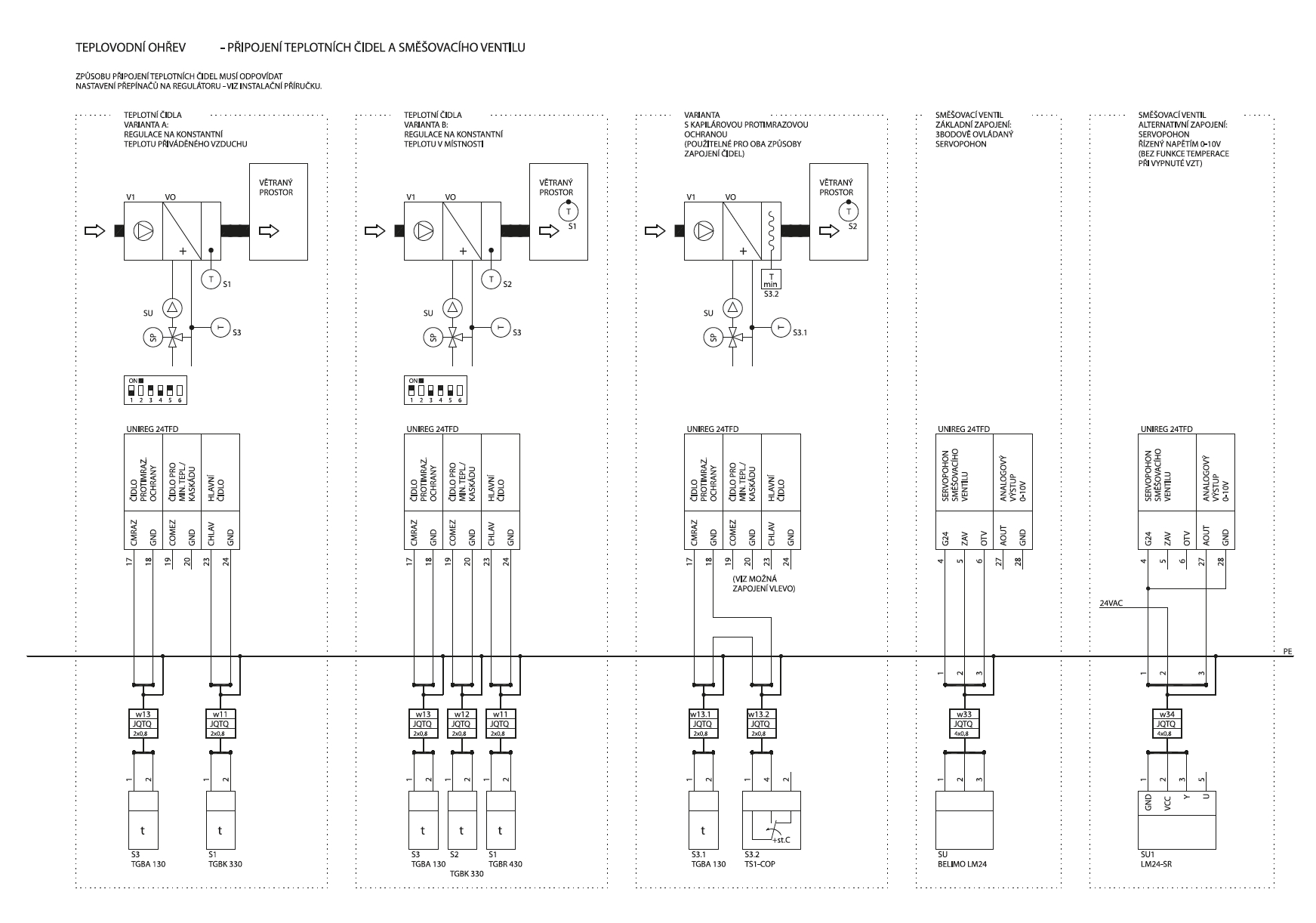 • teplovodní – tříbodově řízený servopohon směšovacího ventilu (alternativně lze použít i servopohon s řídicím napětím 0–10 V).