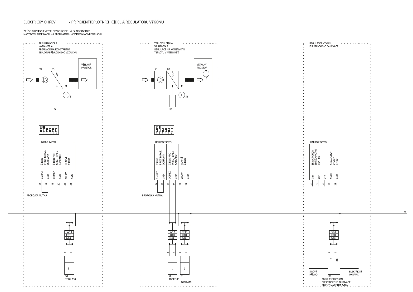 Elektrické ohřívače s vestavěnou výkonovou částí a vstupem 0–10 V mohou být regulátorem řízeny přímo. Elektrické ohřívače bez výkonové části musí být připojeny přes výkonový regulátor (např. JTR 2, JTR 12, JTR 18, JTR 24, TTC 40, TTC 2000).