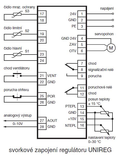 Výstup na servopohon je jištěn pojistkou. Alternativně je možné připojit i servopohon řízený napětím 0–10 V – podrobnosti viz ve schématu.