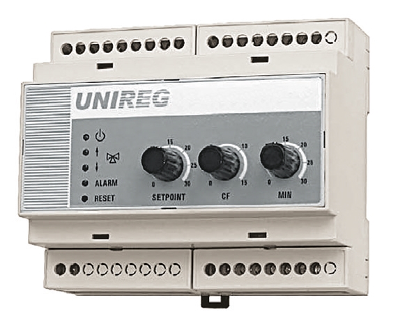 UNIREG je univerzální regulátor určený pro řízení výkonu ohřívače vzduchotechnické jednotky v závislosti na teplotě v místnosti nebo přívodním potrubí. Je k dispozici 3bodový výstup nebo analogový výstup 0–10 V. Ohřívač může být: