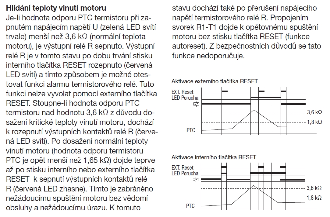 ![]() | Informace Termistorové relé UR 5 R 1021 je určeno pro hlídání teploty vinutí motoru (max 6 PTC) a k ochraně motorů vybavených termokontakty. Relé umožňuje hlídání zkratu měřícího obvodu, samotestování pomocí integrovaného tlačítka reset, funkci paměť alarmu a volitelnou funkci autoreset. Pouzdro je ze samozhášivého plastu, krytí IP40, ochrana proti dotyku IP20. Trvalé propojení svorek je zakázáno. V případě zjištění tohoto stavu je připojený ventilátor bez záruky. | |