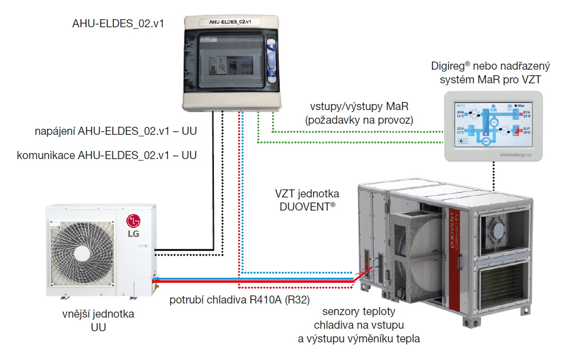 ![]() | Informace Řešení chlazení nebo topení pomocí VZT jednotky s přímým výparníkem/kondenzátorem umožňuje udržovat teplotu v klimatizovaném prostoru s minimální hysterezí +/- 2 °C (za předpokladu správného naprojektování a následného uvedení do provozu). Ventilátory jsou axiální se vzduchovými výkony 1900 až 6960 m3/h. Krytí IP23. Kompresory DC Twin rotační s ochranou proti přetížení. Regulaci výkonu zajišťuje 3D DC Inverter. Chladivo R 410 A nebo R32. Regulace chladiva kapilární trubicí s EEV. Připojení Cu potrubím se šroubením. Provozní podmínky Teplota okolí při chlazení -15 °C až +48 °C, při topení -18 °C až +18 °C. Regulace Pomocí komunikačního modulu AHU-ELDES je kondenzační jednotka ovládána regulací Digireg® používanou v jednotkách DUOVENT® Compact a DUOVENT® Modular. Modul AHU-ELDES_02.v1 je komunikační box pro jednotky LG s možností připojení komunikace Modbus nebo doplňkového Modulu Omezení výkonu (MOV). Provoz VZT jednotky s rekuperací používající venkovní kondenzační jednotku jako tepelné čerpadlo v režimu topení z principu funkce zajistí dostatečnou přívodní teplotu před výparníkem (za normálního provozu a při vhodném nastavení regulátoru). Přívodní VZT jednotky používající venkovní kondenzační jednotku jako tepelné čerpadlo v režimu topení musí být vybaveny směšovací klapkou, která zajistí minimální teplotu před výparníkem +10 °C. Rekuperační VZT jednotky musí být osazeny za výparníkem (před bivalencí) bezpečnostním termostatem, který zajistí přepnutí kondenzační jednotky z režimu chlazení do režimu topení při poklesu teploty pod +12 °C. Je možné osadit i nezávislý elektronicky nastavitelný regulátor teploty. Rekuperační VZT jednotka musí v případě obdržení signálu ODMRAZOVÁNÍ (DEFROST) z venkovní kondenzační jednotky otevřít cirkulační klapku. Pokud takové řešení není možné z aplikačních důvodů (restaurace, kuchyně, zdravotnictví apod.), lze řešit zabránění přívodu studeného vzduchu zastavením přívodního ventilátoru. Pokud ani tato varianta není aplikovatelná, musí být uživatel srozuměn s tím, že po dobu odmrazovacího cyklu bude do vytápěného prostoru přiváděn chladný vzduch. VZT jednotce primárně hrozí možnost zamrznutí okruhu vodního ohřívače nebo bivalentního vodního ohřívače v režimu chlazení. Pokud je navržena koncepce jednotky přímého chlazení s vodním ohřevem, musí být vodní ohřívač umístěn před DX chladičem. Při použití sestavy tepelného čerpadla a vodní bivalence je nejlepší variantou použití nemrznoucí směsi zabraňující zamrznutí vodního okruhu. Pokud tuto alternativu nelze použít, musí být zajištěna celoroční dodávka topné vody do systému před regulačním ventilem tak, aby byly aktivní funkce protimrazové ochrany. VZT jednotky bez vodního ohřevu tuto problematiku řešit nemusí. Tepelné čerpadlo má výrobcem nastavené ochranné technologické časy (doba náběhu, minimální doba chodu, minimální provozní výkon a maximální počet sepnutí v čase) a proto není někdy odezva systému okamžitá a může dojít k určitým prodlevám a překmitům teploty do kladných i záporných hodnot. Upozornění Modul AHU-ELDES_02.v1 nezasahuje do logiky řízení venkovní kondenzační jednotky. Algoritmy řízení otáček kompresoru, kondenzační/vypařovací teploty a kondenzačního/vypařovacího tlaku na výměníku vnější jednotky jsou obsaženy v softwaru PCB venkovních kondenzačních jednotek. Komunikační box nijak nenahrazuje MaR VZT jednotky. | |