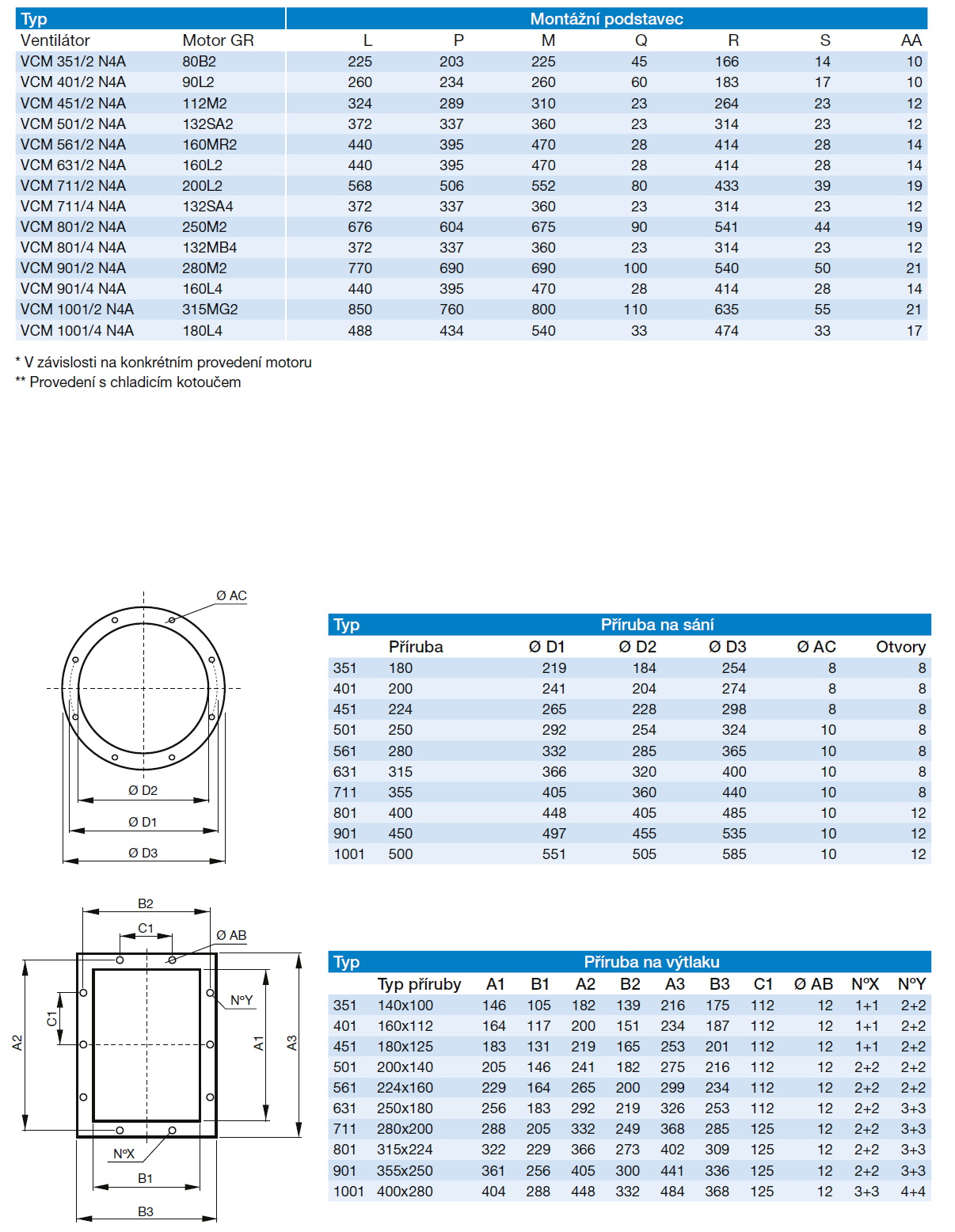 ![]() | Informace Jednostranně sací radiální ventilátor s motorem napřímo. Vyroben z ocelového plechu chráněného kataforezním základním nátěrem a polyuretanovým lakem, RAL 7045. Navržen pro trvalý provoz, teplota přepravované vzdušiny od -20 °C do +60 °C. Motory: 2 nebo 4pólové, IE 3 s vysokou účinností, třífázové provedení 230/400 V, 50 Hz do velikosti motoru 132. Pro velikosti motoru nad 132 400/690 V, 50 Hz. Krytí IP55, izolace třídy F. Všechny motory lze regulovat FM. Na vyžádání: • nerez AISI304, AISI316, CORTEN, CREUSABRO 4800 a další materiály • 60 Hz provedení • lakované v různých barvách RAL • ventilátor bez podstavce (provedení 5) do velikosti motoru 160 • vysokoteplotní provedení (až do 220 °C, provedení B s chladicím kotoučem), do 300 °C provedení 8 nebo 12 • ventilátor s pohonem na spojku (provedení 8) nebo na řemen (provedení 12) • revizní dvířka, odvod kondenzátu, ucpávka hřídele, antivibrační sada, nátrubek pro odvod kondenzátu, ochranná mřížka na sání, plynotěsné provedení, provedení s vyšší otěruvzdorností, svařovaná spirální skříň, tepelně izolovaná spirální skříň ATEX provedení: Na vyžádání možnost dodání v nevýbušném provedení podle směrnice ATEX pro třífázové motory a pro okolní atmosférické podmínky definované normou EN 14986. Rozsah teplot -20 °C až +60 °C, absolutní tlak 0,8 až 1,1 bar. • Plyn: 2G IIB T2-T3-T4, motor ExdIIB nebo ExeII 2G IIB+H2 T2-T3-T4, motor ExdIIC 3G IIB T2-T3-T4, motor ExnA (pouze pro zónu 3G) 3G IIB+H2 T2-T3-T4, motor ExnA (pouze pro zónu 3G) • Nevodivý prach: 2D IIIB T125°C-T135°C-T195°CT295°C 3D IIIB T125°C-T135°C-T195°CT295°C • Vodivý prach (povinný motor IP65): 2D IIIC T125°C-T135°C-T195°CT295°C 3D IIIC T125°C-T135°C-T195°CT295°C | |