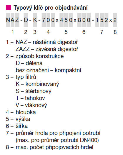 ![]() | Varianty Na vyžádání lze dodat následující varianty digestoří: • s otvorem pro komínek • s kruhovým komínkem s/bez příruby • se čtvercovým komínkem s/bez příruby • se sběrnou vanou pro kondenzát • s výpustným kohoutem na kondenzát • s vypínačem osvětlení • s hrdlem pro připojení přívodního potrubí na boku digestoře • se čtyřhranným hrdlem pro připojení potrubí | |